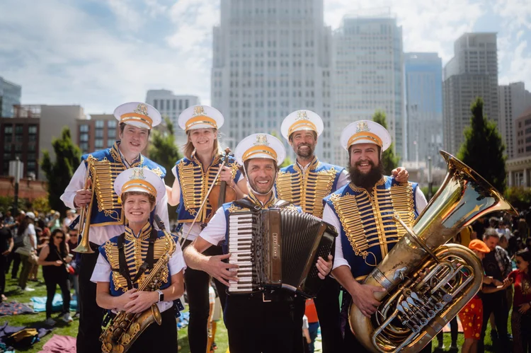 (saxophone), Michael Pinkham (bandleader, percussion), Jonathan Seiberlich (tuba),