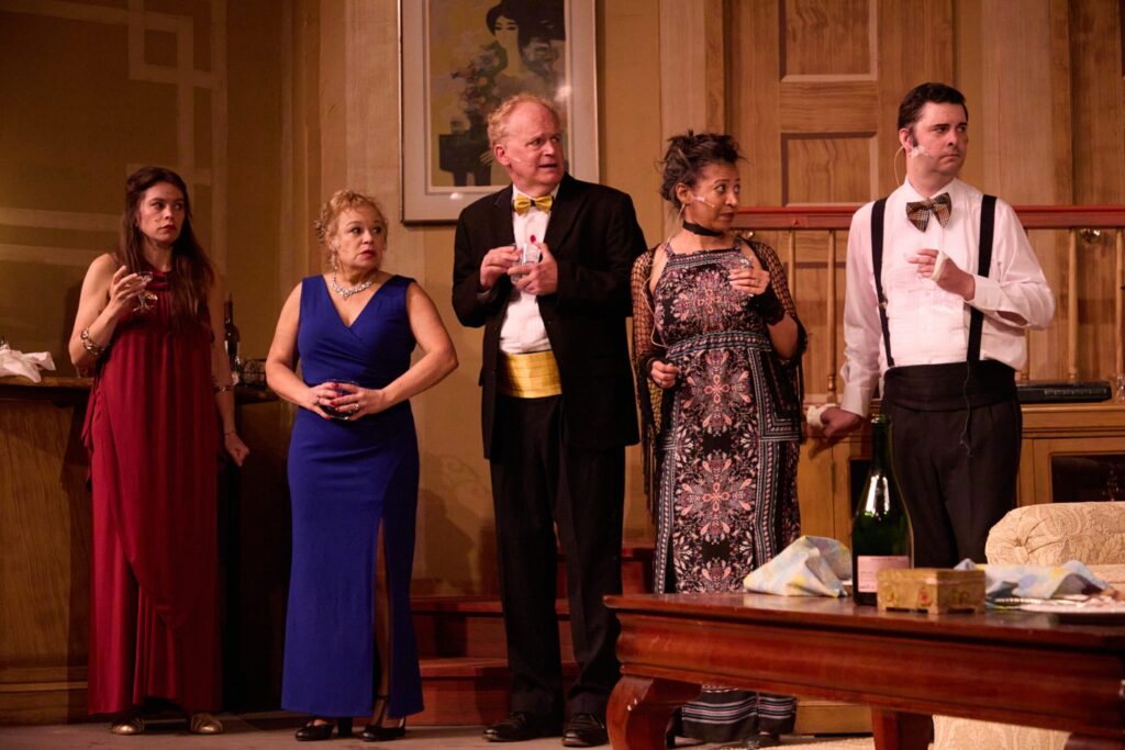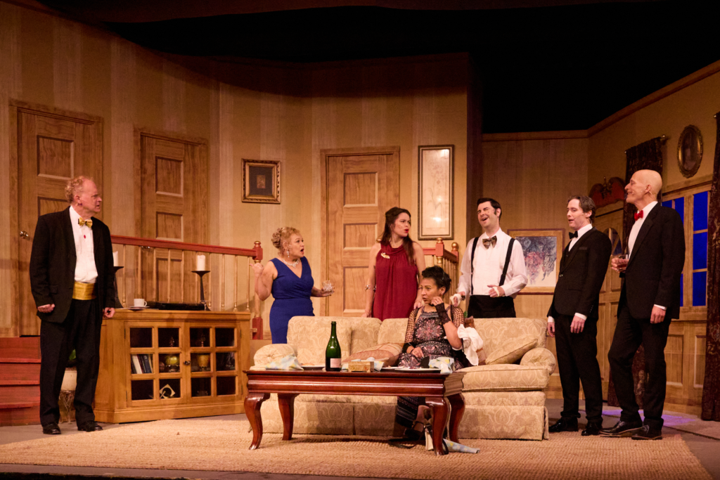 No one prepared food or drinks for the gown-and-tuxedo anniversary evening, making the night even worse. Soon, Lenny (Joshua Roberts) and his gossipy wife Claire (Virgie Poole) become tangled in hiding the gruesome incident.