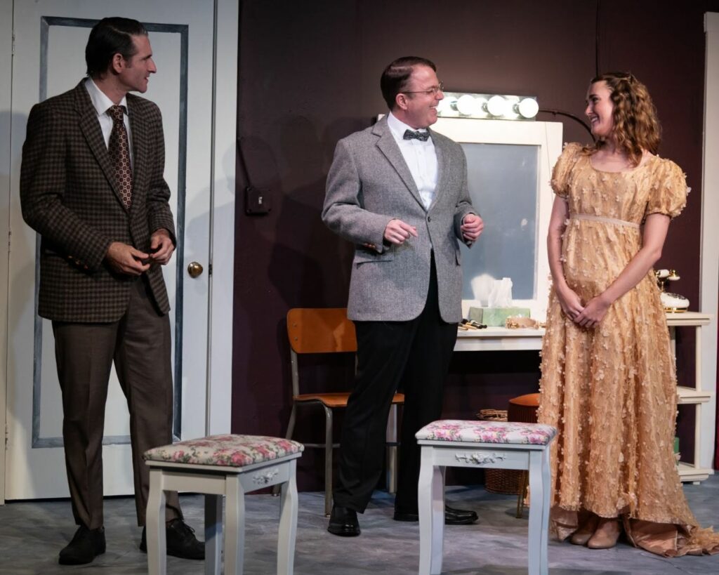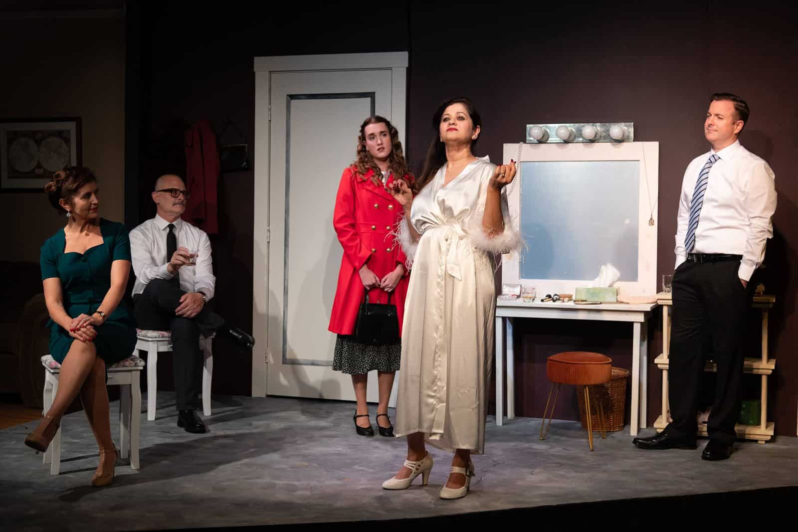 Designer Tom Curtin’s set captures a theater’s front stage, where characters address the audience directly. Upstage right, an antique dressing room invites private conversations, complete with cozy seating and a well-used liquor setup. Upstage left sits the living room of the playwright and his supportive wife—both central to Broadway’s creative world in 1948. With Ava Byrd’s striking period costumes, the audience is transported into the post-war era of evolving Broadway glamour. The dresses are a standout.